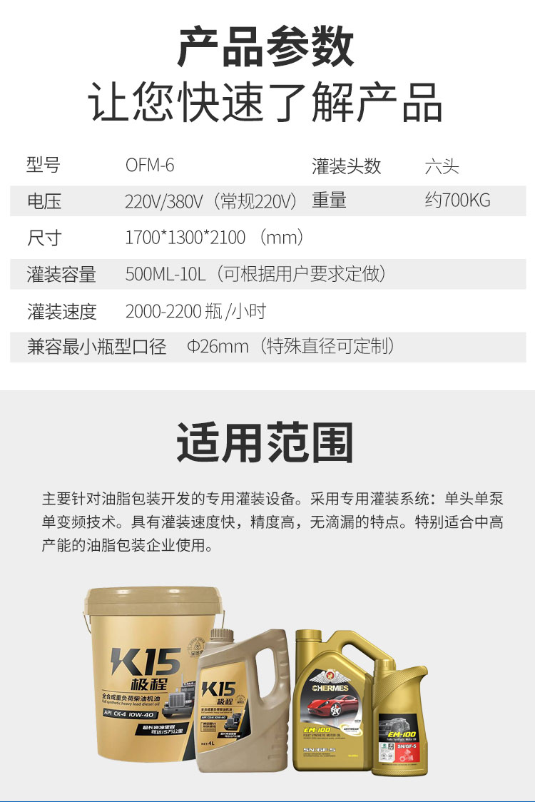 全自動(dòng)六頭稱重潤(rùn)滑油灌裝機(jī)主要針對(duì)油脂包裝開發(fā)的專用灌裝設(shè)備。采用專用灌裝系統(tǒng):?jiǎn)晤^單泵單變頻技術(shù)。具有灌裝速度快
