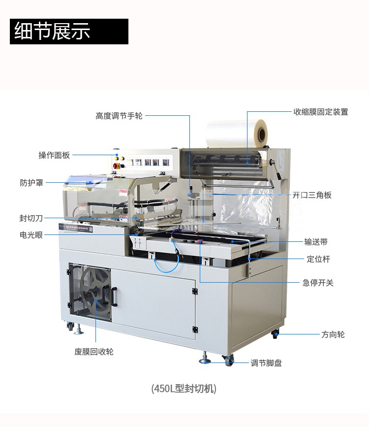 配合L型封切刀使收縮膜包裝一次封切成型,鍍特氟龍不粘層封口布,封切不黏膜,且封口整齊不開(kāi)裂,產(chǎn)品經(jīng)封切后,進(jìn)入自動(dòng)塑料膜熱收縮包裝機(jī)完成包裝。
